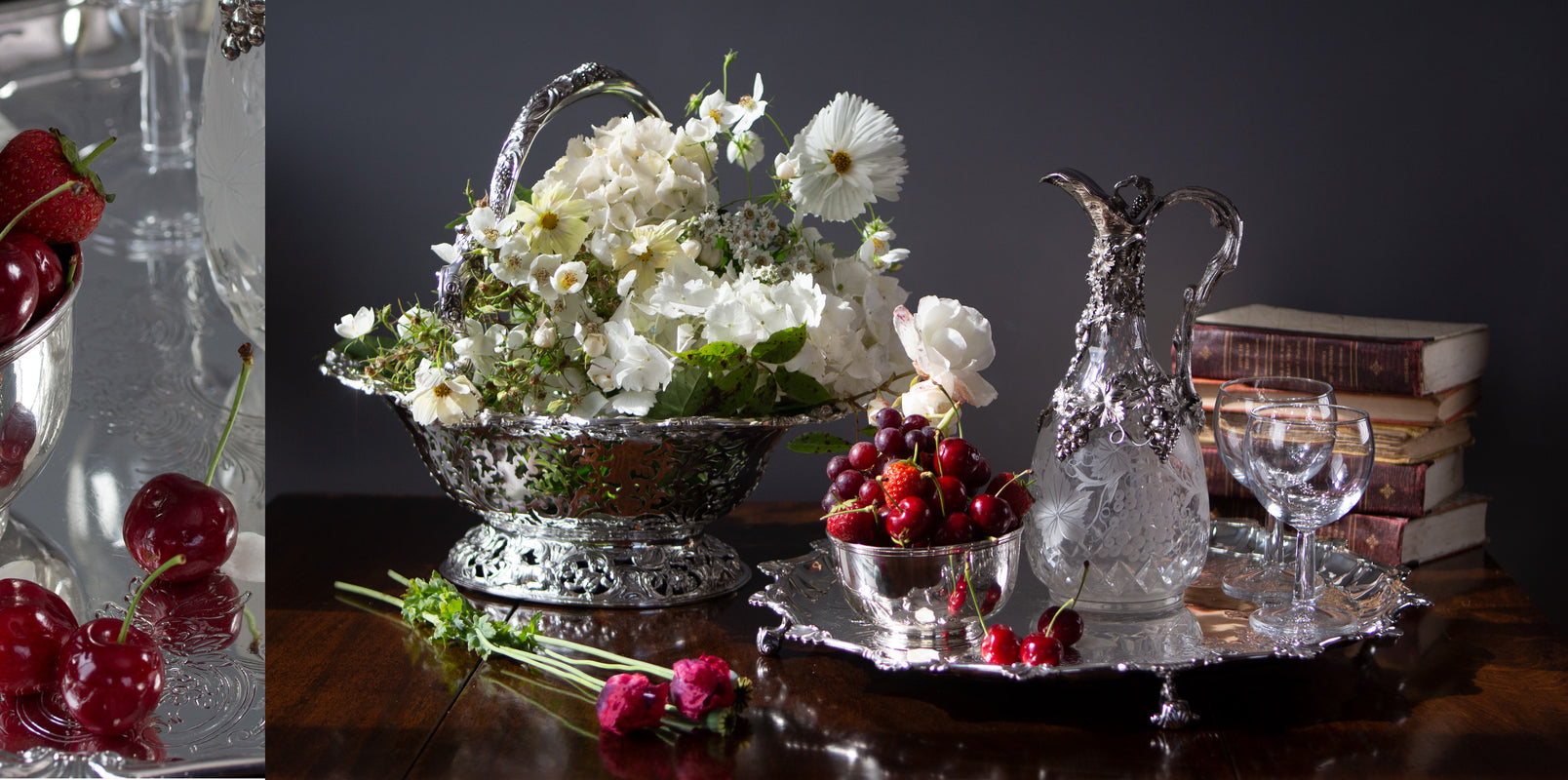 Antique silver filled with suculent summer fruits: a seasonal display of sensual delight...