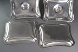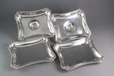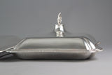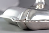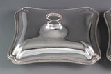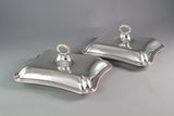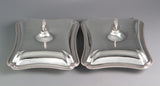 A rare pair of eighteenth century cushioned form entrée or vegetable dishes, with pinched in corners and a beaded rim. The raised lid is shaped up to the oval beaded handle. Both the body and lid are engraved with a contemporary coat-of-arms.