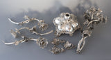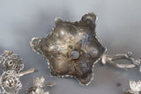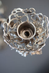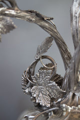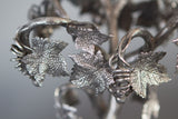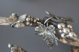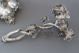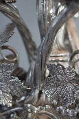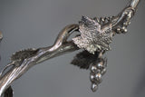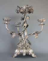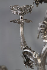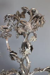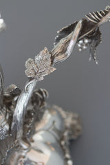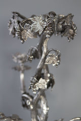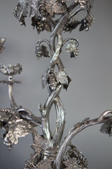 A spectacular late 19th century silver plated table centrepiece or candelabra cast as a fruiting vine. With realistic bark, leaves, tendrils and bunches of grapes. The whole standing on three shell form shaped feet. Each of the parts can be individually removed. Each of the candle sconces can be unscrewed. The three branches can be removed from the base and the main entwined stem can also be unscrewed from the base. The three decorative pieces at the foot of the trunk are attached via a nut from the underside.
