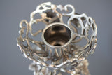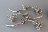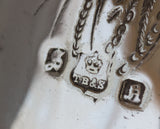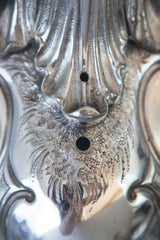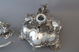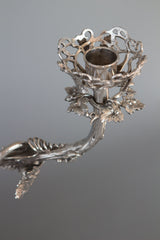 It carries the mark of Thomas Bradbury of Sheffield. This firm was renowned for the extremely high quality of its silverplate work. This piece would date from about 1890. Each of the arms is numbered one, two or three with corresponding marks on the base as are the decorative pieces at the foot of the trunk.