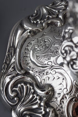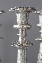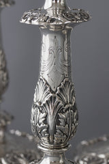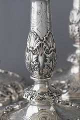 A Very good and imposing set of silver table candlesticks each on a shaped circular shell scrolled base below a leaf and shell decorated baluster stem supporting a campana socket. Conforming shell scrolled sconces. Original baize to bases.