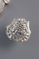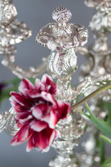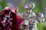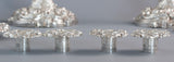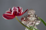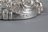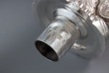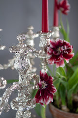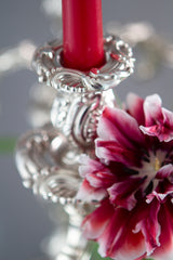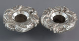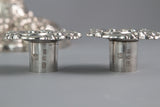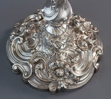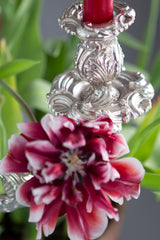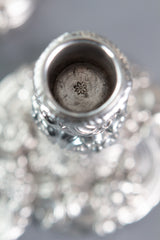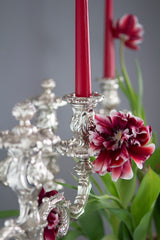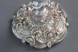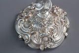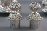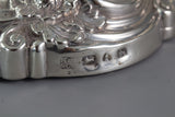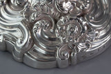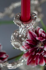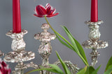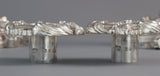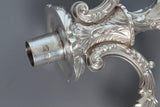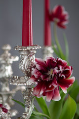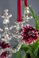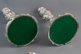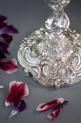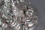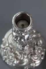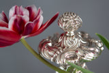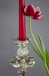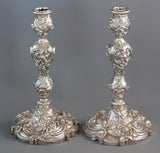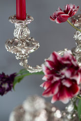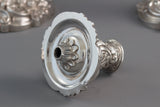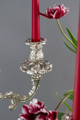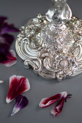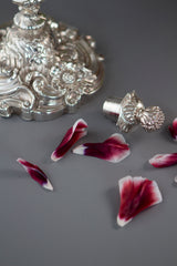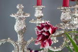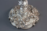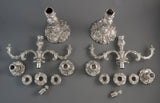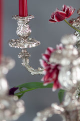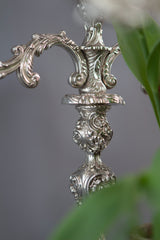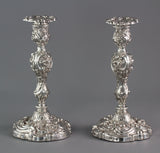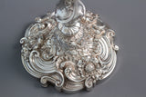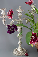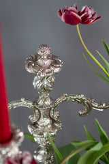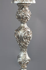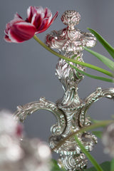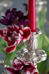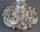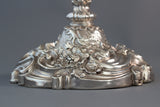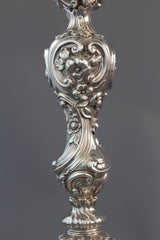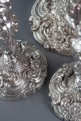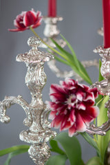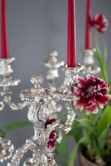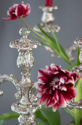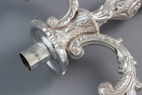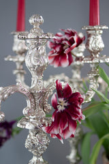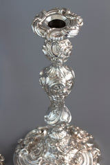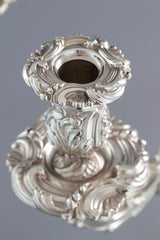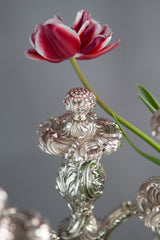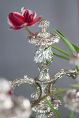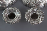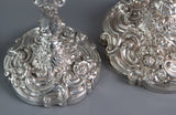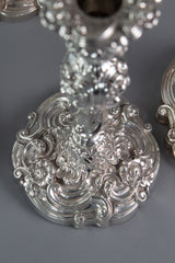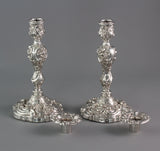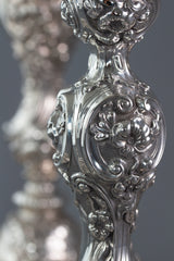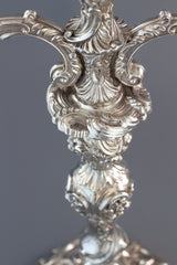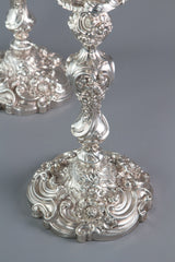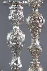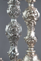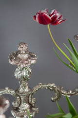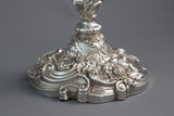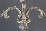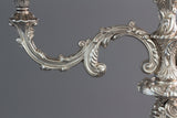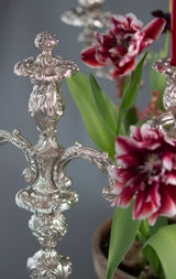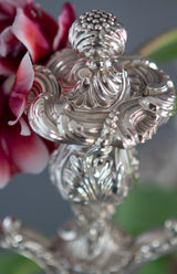 A superb table suite featuring a pair of 3-light candelabra with an accompanying pair of smaller candlesticks. All decorated in the Rococo manner with scrolling foliage, shells and roses, surmounted with a thistle decorated central snuffer. The decoration is reminiscent of William Dunbar’s poem ‘The Thistle and the Rose’.