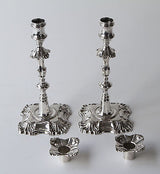 A very fine pair of cast silver table candlesticks of shaped square form with shell corners. The tapered fluted column with a flared knop and a spool shaped capital. Conforming shell cornered sconces.