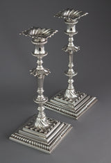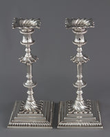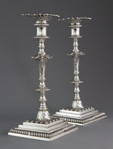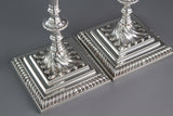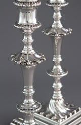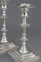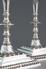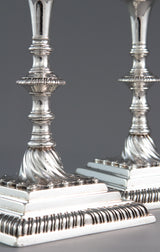 A superb pair of cast silver George III silver table candlesticks with square step bases, spiral stem with gadrooned knops and conforming sconces.