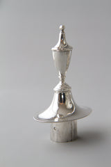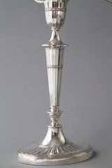 Each with fluted stems with raised reed band over a spreading, fluted foot with red decoration to the borders. The urn-shaped capitals and sconces are similarly decorated. The candelabra has four elegantly twisted arms with urn capitals and a raised central stem surmounted with a sconce with a removable stopper. All decorated in the same manner as the rest of the suite. The candelabra branch is removable to allow the main stem to be used as a candlestick.