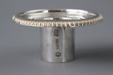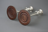 A superb pair of Georgian silver table candlesticks of  circular form. The raised base with gadroon decoration as are the two knops. The upper one flared beneath an urn shaped capital. Conforming removable sconces. Both with original turned and polished wooden bases. Both crested to the base with a gryphon's head.