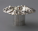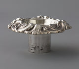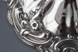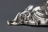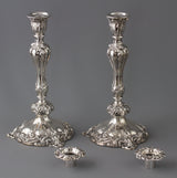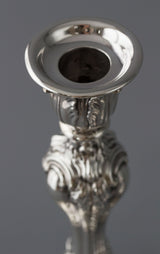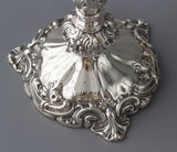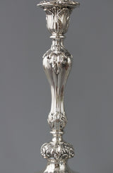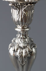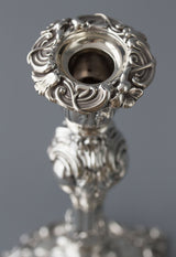 A superb pair of tall early Victorian candlesticks in the Rococo revival style, with detachable conforming drip-pans and acanthus and floral decoration, inverted baluster stems to scrollwork tripartite loaded bases. Each with crest to base.