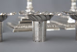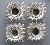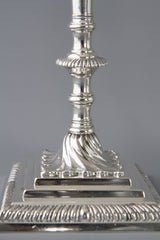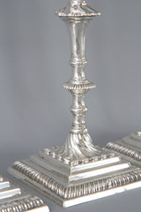Absolutely superb set of four cast Silver table candlesticks by specialist maker William Cafe on stepped square bases with fluted edge with a spiral twist to the bottom of the stem rising to a fluted knop and a further spiral decorated knop below a cotton reel capital with gadrooned borders. The sconces of square form with fluted spiral form gadrooned borders.