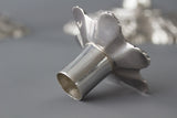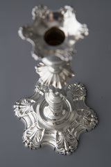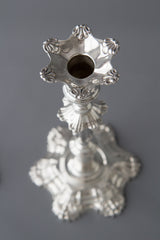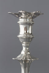An extremely fine set of cast Silver candlesticks of petal form decoration rising from a stepped, circular, rope twist decorated base to a tapered fluted column beneath a hexagonal knop. The capitals of cotton reel form with rope twist decoration. Conforming removable sconces.