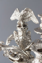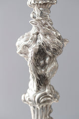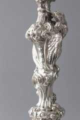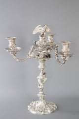 An outstanding pair of George III silver candelabra cast in the neo-rococo, four elements pattern. Each standing on a shaped circular base rising to a knopped baluster stick. The removable arms with three scrolling foliate branches leading to circular, eagle & feather decorated drip pans, surmounted with spool-shaped sockets and removable sconces. Rising from the center of the arms is a further inverted pear-shaped shaped column to a drip pan, socket and sconce, topped with a removable eagle finial. The candelabra are cast and chased throughout with representations of the four elements surrounded with flowers, scrolls and rocaille on a matted ground. The bases cast with a lion, dolphin and dragon, and the main stems are enwrapped with the lion and eagle, all rising to a cast removable finial/snuffer of a rising eagle with wings spread, allowing the pair to be used as a three-light or a four-light combination.