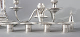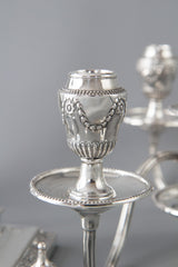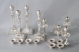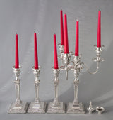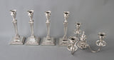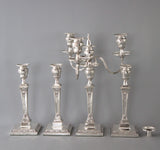 This is an extremely attractive and highly unusual set of four candlesticks and candelabra combination. Very elegant and of superb design and execution. All the candlesticks are loaded and the candelabra is solid silver.