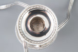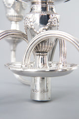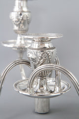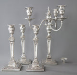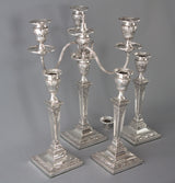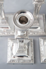 A set of four Victorian silver candlesticks in Adams style with square tapered stems and gadrooned urn shaped capitals. The stepped bases decorated with beaded edges and garland of flowers. This motif is repeated at the base of the stem and the flared plinth beneath the capital. Conforming circular sconces. The candelabra with beaded decoration and reeded scrolling branches and detachable shaped finial.