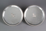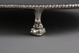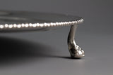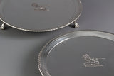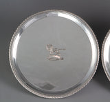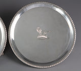 An excellent pair of silver waiters or small trays of circular form with gadrooned rims standing on three claw and ball feet. The center of each engraved with a standing lion above a coronet facing outward with its tail extended.
