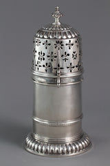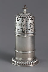 A very rare 17th century large silver sugar caster of lighthouse form. Rising up from a spreading knurled foot, the plain body with reeded band decoration. The bayonet fitted lid is simply decorated with symmetrical piercing, topped with matching decoration to the foot and surmounted with an acorn finial.