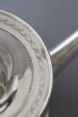 This teapot was typical of the period and took the form similar in shape to the chocolate or coffee pot. However, due to the very high cost of tea at this time, teapots were very small, and other pots made in the same period were more melon shaped, taking their form from the Chinese earthenware pots, which were increasing in popularity throughout Europe. It was found that silver was the perfect material for brewing tea in because of its heat properties and its durable nature.