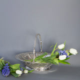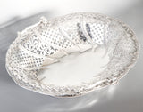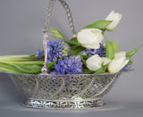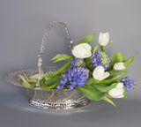A Very Fine George III Silver Basket by William Plummer, London 1761. Of oval form, with pierced sides alternating in sections between cross and foliate patterns separated by tapering embossed beaded design. Shell and gadrooned boarder. Rope twist pierced handle all standing on a pierced foot.