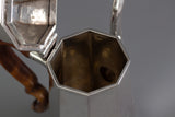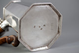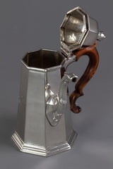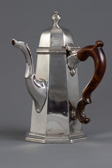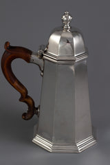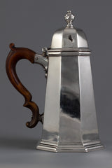A very rare and extremely important George I Britannia standard silver coffee pot of octagonal tapering panelled form. Shaped swan neck spout and tapering domed octagonal lid with sceptre finial. With carved double C-scroll fruit wood handle with thumb piece. The whole standing on a stepped foot.