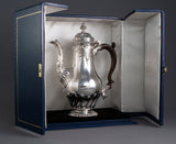 The case carries a silver plaque bearing the inscription ' This George II silver coffee pot made by Samuel Courtauld in 1757 was presented to Sipko Huismans on 16 July 1996 by his colleagues on the Board of Courtaulds plc to mark his retirement after 35 years service including 12 years as a Director and 5 years as Chief Executive'.