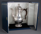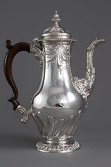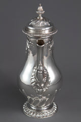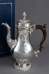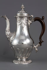 An important George II silver coffee pot by Samuel Courtauld, London 1757. Of raised baluster form, embossed scroll and fluted decoration, cast leaf capped spout, the hinged cover with a fluted acorn finial, and gadroon border, on a raised circular foot with a gadroon border, in a later fitted presentation case, by Richard Parsons.