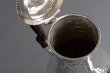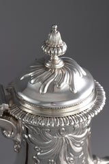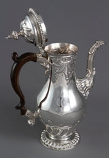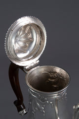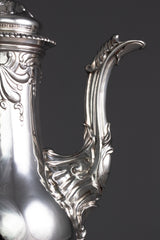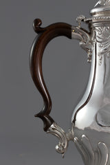 This is a rare museum quality coffee pot of very good gauge and has a lovely colour and patina. It is made by one of the most highly regarded Huguenot silversmiths of the eighteenth century, and as he died at the age of 45, that of his work which has survived is very scarce indeed! His work is characterised by a mild rococo taste, attractively executed, of which this beautiful coffee pot is an exceedingly superb example.