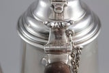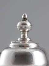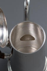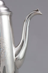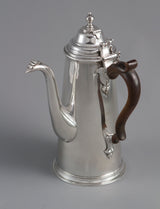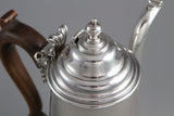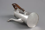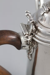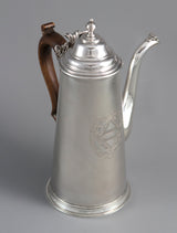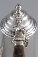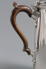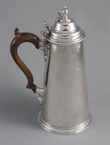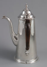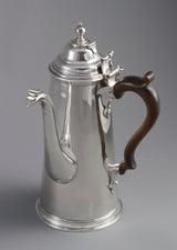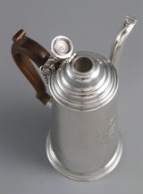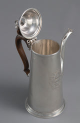 A very rare and important William III Britannia standard silver chocolate pot of tapered circular form The stepped domed lid with scroll thumbpiece and a separate small lid for the insertion of a chocolate stirrer. Hinged pin with attached chain for removal of the lid. Swan neck spout with hinged lid. Fruitwood scroll handle at right angles to spout. Skirted base.