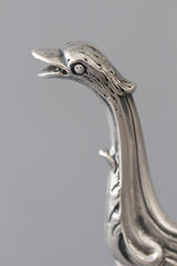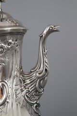 A Georgian silver coffee pot of baluster form. The ornate cast swan neck spout with a ducks head as the pouring part. The body heavily chased and engraved with floral designs and a cornucopia of flowers arising from an urn. One side with a rocaille cartouche depicting a bird with a key in its beak. The waveform domed cover with conforming decoration and a flower finial. Original shaped fruit wood handle with thumbpiece. The whole standing on a circular decorated foot.