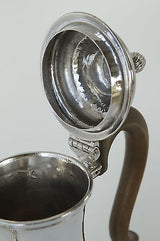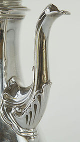 A very attractive coffee pot in absolutely original condition with no damage or repair. The gauge of the silver is very good and the lid fits well with almost no movement to the hinge. The handle is firm with no cracks, chips or splits. A few very minor bruises to the bulbous part of the body. The hallmarks are rubbed with the makers mark considerably worn. Lovely colour and patina.