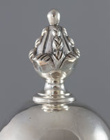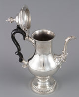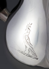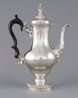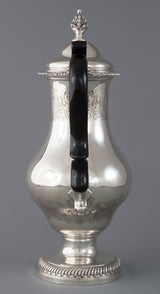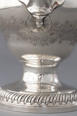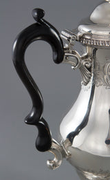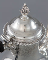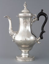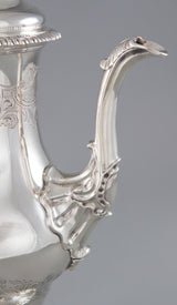A rare and highly unusual George III silver coffee pot of baluster form. The domed hinged cover with an acorn finial. An ebonised fruit wood double C- scroll handle. A leaf capped swan neck spout, chased shell and floral decoration to the upper and lower portion of the body. Crested to one side with a bird of prey with a branch in its beak. Standing on a spreading circular foot, with gadrooned border. Provenance: The Estate of the late Sir Edward du Cann KBE (1924-2017).