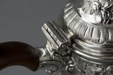 An Impressive George II Silver Coffee Pot of tapered baluster form, with a cast and applied spout, surmounted by a raised, domed lid with a cast pinecone finial. Original scroll fruitwood handle. All standing on a raised circular foot. The pot is beautifully decorated throughout with a high-relief - chased & embossed, foliate, scroll and shell pattern, typical of the period. Vacant cartouches to either sides.