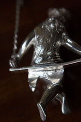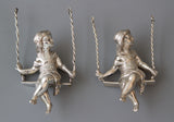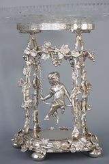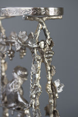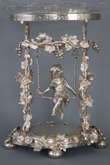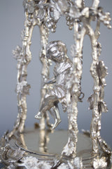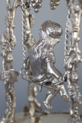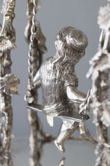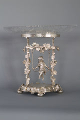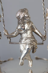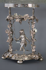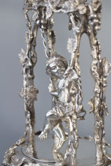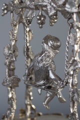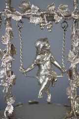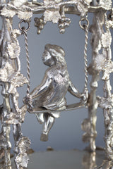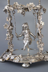 An exceptional pair of silver table epergnes on shaped oval bases with an arbour in which a swing is suspended with a young girl on the seat, surmounted by oval glass dishes. The wooden arbour is decorated with a twining and fruiting vine. The bottom of the base is encircled by twining vine branches. The girls swing at the slightest touch and remain in movement for several minutes. One of the girls is made so that her foot is only just above the mirror plateau and the other girl is made with her legs higher up.