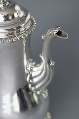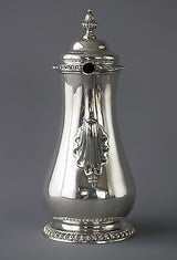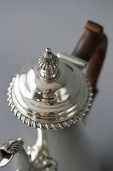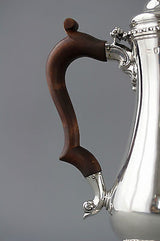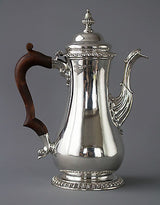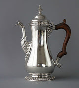 A Very good George II silver coffee pot of baluster form. Swan neck spout with fluted mounting. Domed baluster lid with fluted acorn finial. Double C scroll fruitwood handle. The foot of raised gadrooned form.