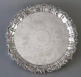 Very good silver salver of circular form with cast and applied foliate, floral and shell form border. The plate engraved with flowers and leaves against a matt background. The central reserve crested with the armorial of the McDonald clans depicting a three Tower Castle with a right arm extending from the central turret holding a sword above which is the Gaelic inscription meaning "My hope is constant in thee." To the reverse is a dedication inscription to a member of the McDonald's clan from Dalilea. The whole stands on three fluted and leaf decorated cast silver feet.