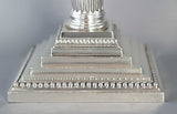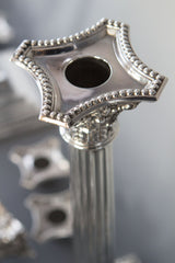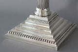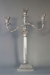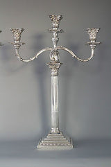 A very imposing tall pair of mid Victorian silver three light candelabra on square stepped bases with Corinthian columns. Beaded decoration to both bases  and all sconces. Each stick with a pair of curved leaf patterned arms and conforming Corinthian capitals. The central column with wrythen tapered stem leading to a conforming Corinthian capital. All the sconces and central columns are removable and the central stem swivels freely thus allowing the lights to be positioned wherever is best suited.