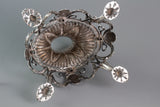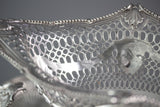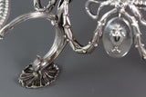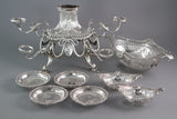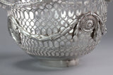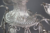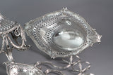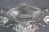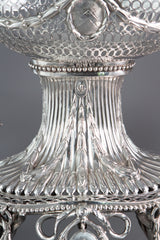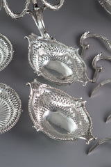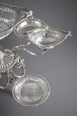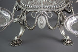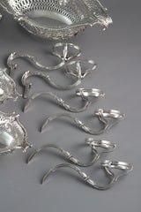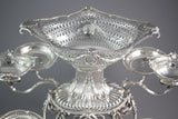 The epergne with seven detachable baskets or dishes, the arms and baskets or dishes each numbered & marked, the central basket with engraved oval heraldic shield to either side, the baskets & dishes each with an engraved seated unicorn crest. The stand on four scroll supports linked by cast aprons of flowering foliage and ribbon tied swags with an urn embossed shield to each of the four sides. Standing on pierced scrolling leaf capped pad feet. Each of the pierced baskets with conforming decoration. The central column of ribbed wicker form with festooned swags. The two higher baskets can be swivelled in their rests. Each arm detachable as are all the baskets and the central column.