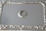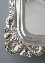 An extremely good pair of early Victorian silver entree dishes. Traditional cushion form with large and extremely attractive cast silver border of shell and scroll decoration. The lids with a removable cast silver handle of floral and foliate design.