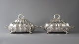 This superb pair of vegetable tureens or entree dishes are of shaped, raised and fluted lobed form, surmounted with a removable acanthus final.