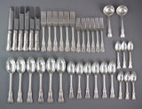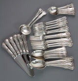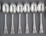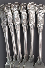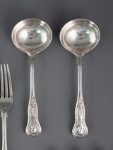 An extremely good set of Kings pattern Victorian silver tableware for six people consisting of six dinner or table forks, six dessert forks, six dessert spoons, six serving or tablespoons, two sauce ladles, six teaspoons and six table knives.